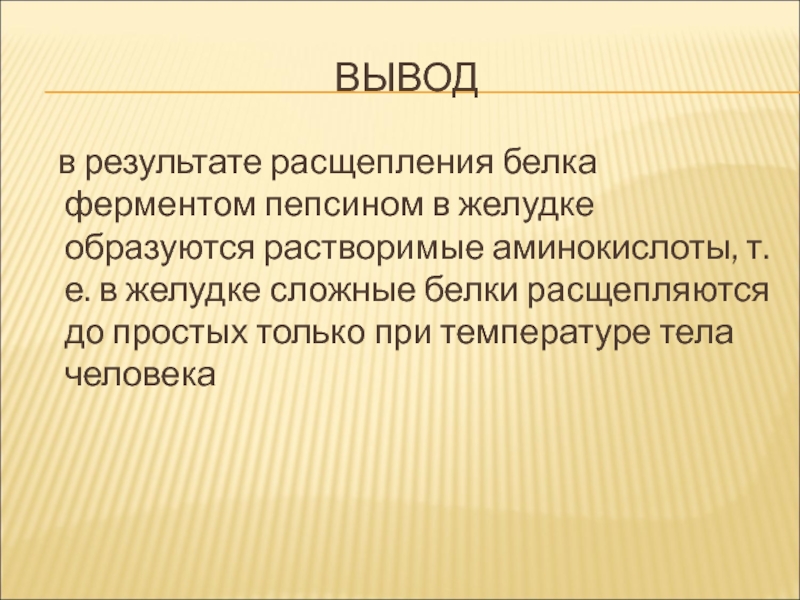 растворимые аминокислоты, т.е. в желудке сложные белки расщепляются до простых только при температуре тела человека