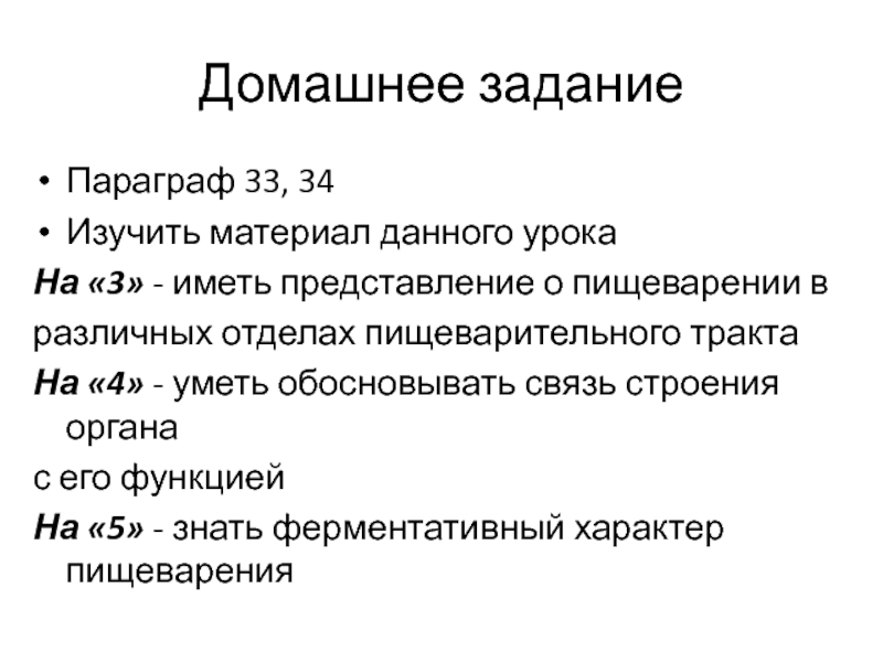 Домашнее заданиеПараграф 33, 34Изучить материал данного урокаНа «3» - иметь представление о пищеварении вразличных отделах пищеварительного трактаНа «4» -