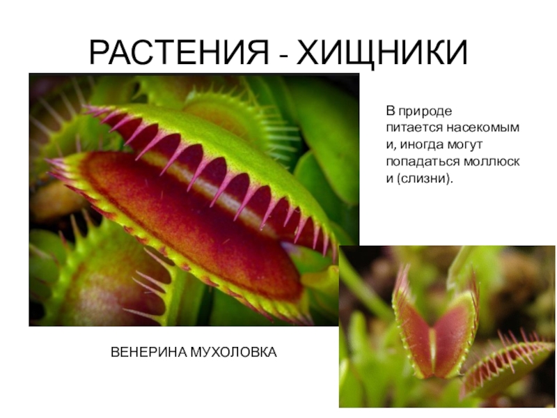 РАСТЕНИЯ - ХИЩНИКИВЕНЕРИНА МУХОЛОВКАВ природе питается насекомыми, иногда могут попадаться моллюски (слизни).