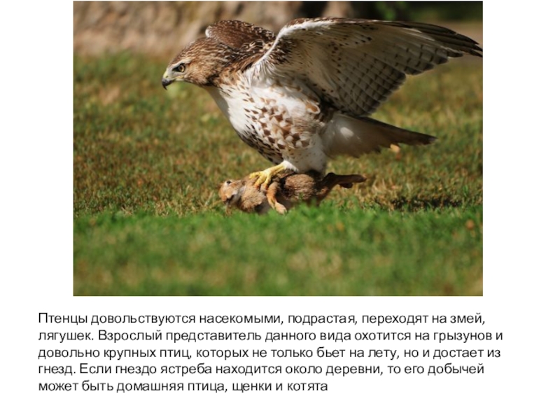 Слайд 7Птенцы довольствуются насекомыми, подрастая, переходят на змей, лягушек. Взрослый представитель данного