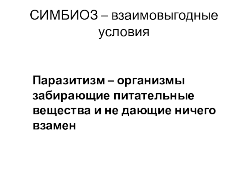 СИМБИОЗ – взаимовыгодные условияПаразитизм – организмы забирающие питательные вещества и не дающие ничего взамен