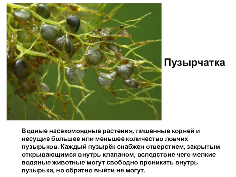 ПузырчаткаВодные насекомоядные растения, лишенные корней и несущие большее или меньшее количество ловчих пузырьков. Каждый пузырёк снабжен отверстием, закрытым открывающимся внутрь