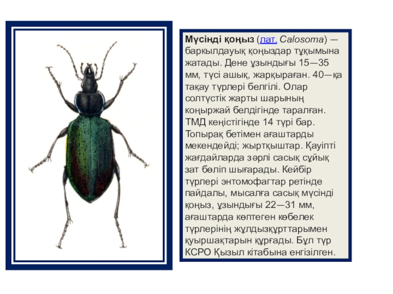 Слайд 11Мүсінді қоңыз (лат. Calosoma) — баркылдауық қоңыздар тұқымына жатады. Дене ұзындығы 15—35 мм,