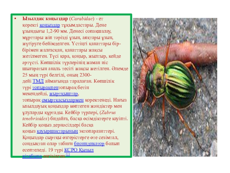 Слайд 10Ызылдақ қоңыздар (Carabidae) - ет қоректі қоңыздар тұқымдастары. Дене ұзындығы 1,2-90 мм. Денесі сопақшалау,