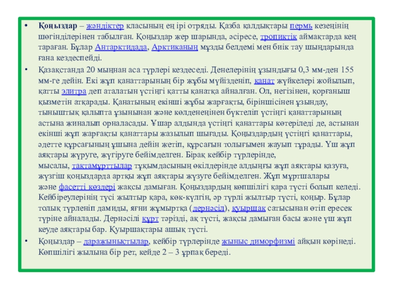 Слайд 3Қоңыздар – жәндіктер класының ең ірі отряды. Қазба қалдықтары пермь кезеңінің шөгінділерінен табылған. Қоңыздар жер шарында,