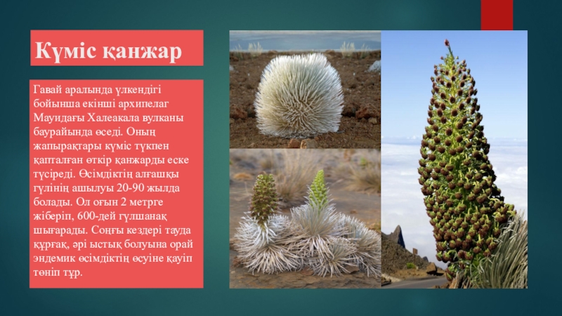 өседі. Оның жапырақтары күміс түкпен қапталған өткір қанжарды еске түсіреді. Өсімдіктің алғашқы гүлінің ашылуы 20-90 жылда болады. Ол оғын 2 метрге жіберіп, 600-дей гүлшанақ шығарады. Соңғы кездері тауда құрғақ, әрі ыстық болуына орай эндемик өсімдіктің өсуіне қауіп төніп тұр.