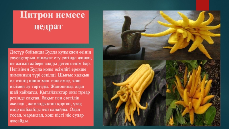 қулықпен өзінің саусақтарын мінәжат ету сәтінде жинап, не жазып жібере алады деген сенім бар. Негізінен Будда қолы өсімдігі ерекше лимонның түрі секілді. Шығыс халқын ол өзінің пішінімен ғана емес, хош иісімен де тартады. Жапонияда одан шай қайнатса, Қытайлықтар оны тұмар ретінде сақтап, бақыт пен сәттілік әкеледі , жамандықтан қорғап, ұзақ өмір сыйлайды деп санайды. Одан тосап, мармелад, хош иісті иіс сулар жасайды.