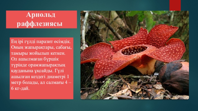 ірі гүлді паразит өсімдік. Оның жапырақтары, сабағы, тамыры жойылып кеткен. Ол ашылмаған бүршік түрінде орамжапырақтың қауданына ұқсайды. Гүлі ашылған кездегі диаметрі 1 метр болады, ал салмағы 4 – 6 кг-дай.