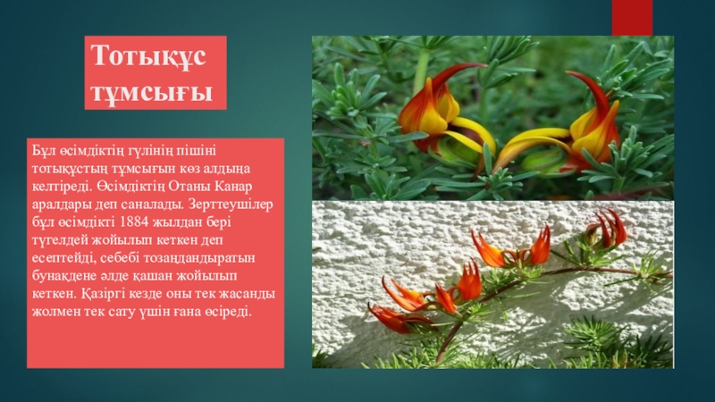 Бұл өсімдіктің гүлінің пішіні тотықұстың тұмсығын көз алдыңа келтіреді. Өсімдіктің