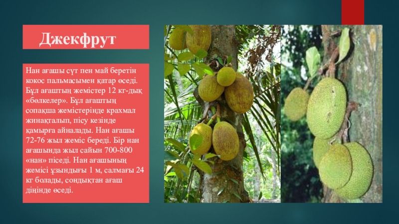 қатар өседі. Бұл ағаштың жемістер 12 кг-дық «бөлкелер». Бұл ағаштың сопақша жемістерінде крахмал жинақталып, пісу кезінде қамырға айналады. Нан ағашы 72-76 жыл жеміс береді. Бір нан ағашында жыл сайын 700-800 «нан» піседі. Нан ағашының жемісі ұзындығы 1 м, салмағы 24 кг болады, сондықтан ағаш діңінде өседі.