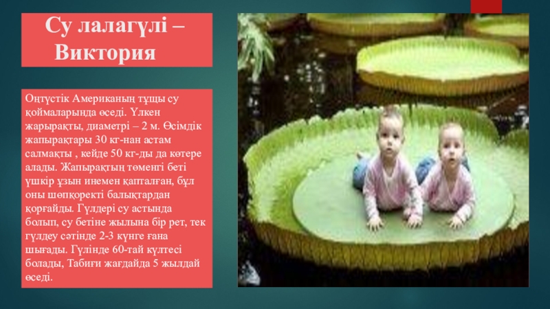 тұщы су қоймаларында өседі. Үлкен жарырақты, диаметрі – 2 м. Өсімдік жапырақтары 30 кг-нан астам салмақты , кейде 50 кг-ды да көтере алады. Жапырақтың төменгі беті үшкір ұзын инемен қапталған, бұл оны шөпқоректі балықтардан қорғайды. Гүлдері су астында болып, су бетіне жылына бір рет, тек гүлдеу сәтінде 2-3 күнге ғана шығады. Гүлінде 60-тай күлтесі болады, Табиғи жағдайда 5 жылдай өседі.