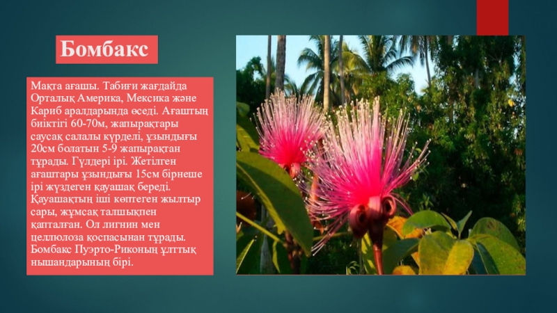 Кариб аралдарында өседі. Ағаштың биіктігі 60-70м, жапырақтары саусақ салалы күрделі, ұзындығы 20см болатын 5-9 жапырақтан тұрады. Гүлдері ірі. Жетілген ағаштары ұзындығы 15см бірнеше ірі жүздеген қауашақ береді. Қауашақтың іші көптеген жылтыр сары, жұмсақ талшықпен қапталған. Ол лигнин мен целлюлоза қоспасынан тұрады. Бомбакс Пуэрто-Риконың ұлттық нышандарының бірі.
