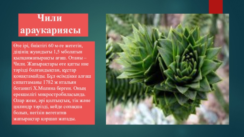 жуандығы 1,5 мболатын қылқанжапырақты ағаш. Отаны – Чили. Жапырақтары өте қатты ине тәрізді болғандықтан, құстар қонақтамайды. Бұл өсімдікке алғаш сипаттаманы 1782 ж итальян ботанигі Х.Молина берген. Оның ерекшелігі микростробиласында. Олар жеке, әрі қолтықтық, тік және цилиндр тәрізді, кейде сопақша болып, негізін вегетатив жапырақтар қоршап жатады.