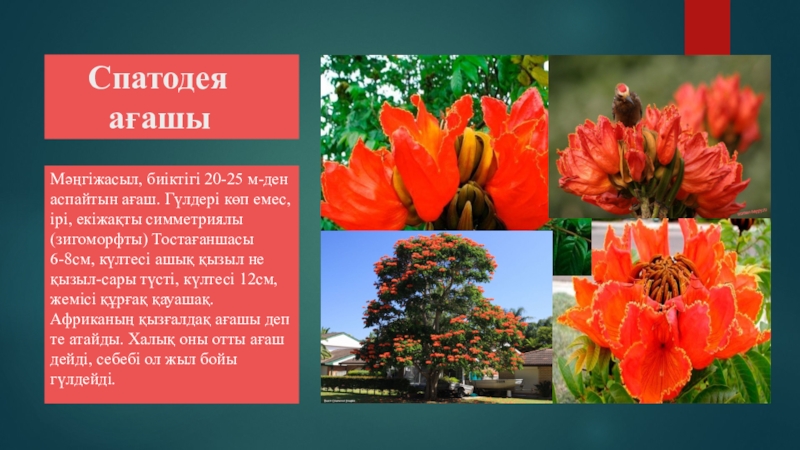 аспайтын ағаш. Гүлдері көп емес, ірі, екіжақты симметриялы (зигоморфты) Тостағаншасы 6-8см, күлтесі ашық қызыл не қызыл-сары түсті, күлтесі 12см, жемісі құрғақ қауашақ. Африканың қызғалдақ ағашы деп те атайды. Халық оны отты ағаш дейді, себебі ол жыл бойы гүлдейді.