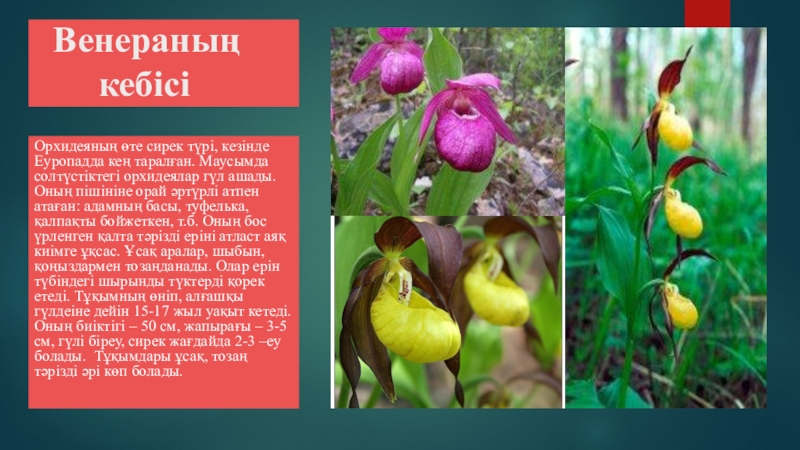 Еуропадда кең таралған. Маусымда солтүстіктегі орхидеялар гүл ашады. Оның пішініне орай әртүрлі атпен атаған: адамның басы, туфелька, қалпақты бойжеткен, т.б. Оның бос үрленген қалта тәрізді еріні атласт аяқ киімге ұқсас. Ұсақ аралар, шыбын, қоңыздармен тозаңданады. Олар ерін түбіндегі шырынды түктерді қорек етеді. Тұқымның өніп, алғашқы гүлдеіне дейін 15-17 жыл уақыт кетеді. Оның биіктігі – 50 см, жапырағы – 3-5 см, гүлі біреу, сирек жағдайда 2-3 –еу болады. Тұқымдары ұсақ, тозаң тәрізді әрі көп болады.
