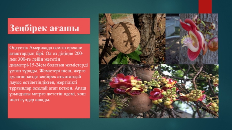 200-ден 300-ге дейін жететін диаметрі-15-24см болатын жемістерді ұстап тұрады. Жемістері пісіп, жерге құлаған кезде зеңбірек атылғандай дауыс естілетіндіктен, жергілікті тұрғындар осылай атап кеткен. Ағаш ұзындығы метрге жететін әдемі, хош иісті гүлдер ашады.