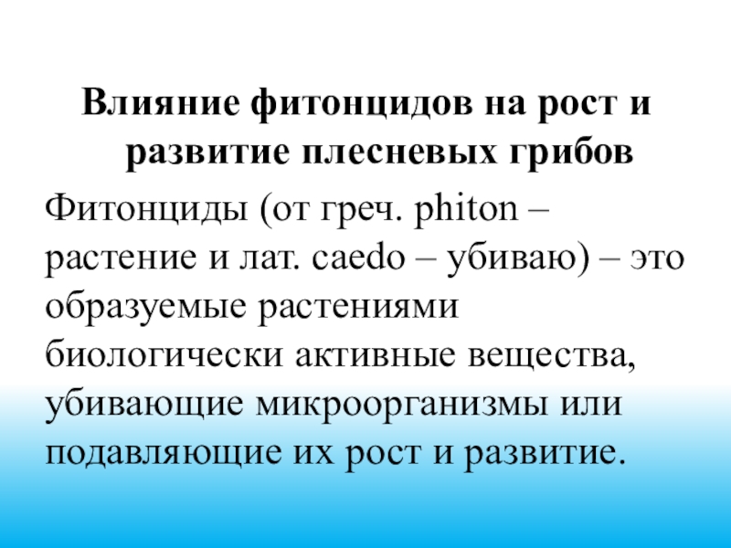 Влияние фитонцидов на рост и развитие плесневых грибовФитонциды (от греч. phiton – растение и лат. caedo – убиваю) –