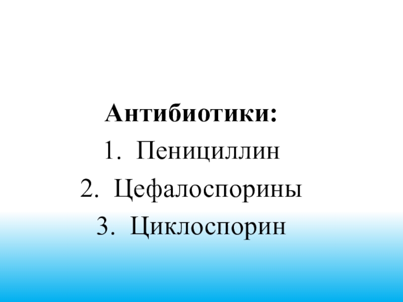 Антибиотики: 1.  Пенициллин2.  Цефалоспорины3.  Циклоспорин