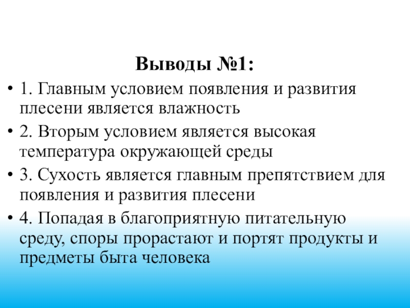 Выводы №1:1. Главным условием появления и развития плесени является влажность2. Вторым условием является высокая температура окружающей среды3.