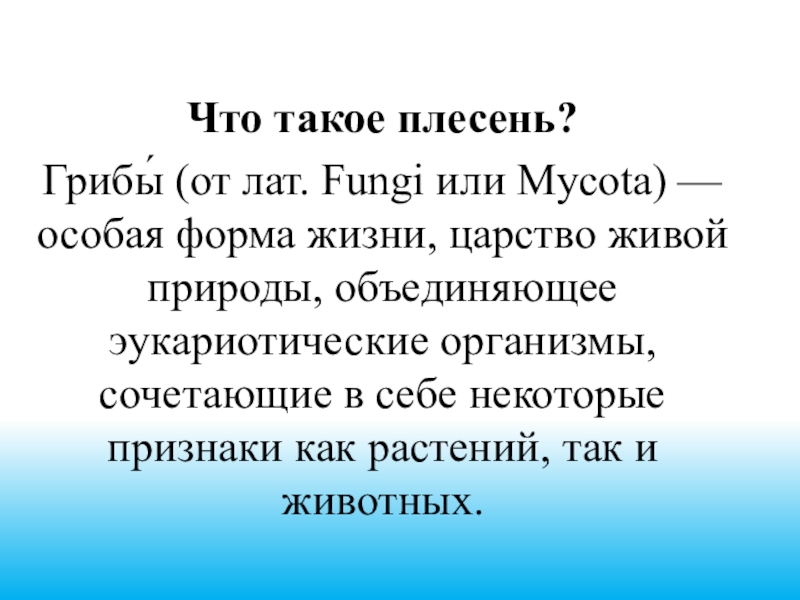 Что такое плесень?Грибы́ (от лат. Fungi или Mycota) — особая форма жизни, царство живой природы, объединяющее эукариотические организмы,