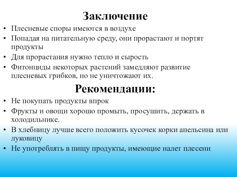 ЗаключениеПлесневые споры имеются в воздухеПопадая на питательную среду, они прорастают и портят продуктыДля прорастания нужно тепло и