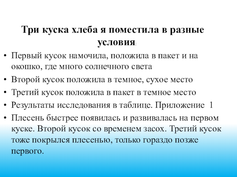 Слайд 11Три куска хлеба я поместила в разные условия: