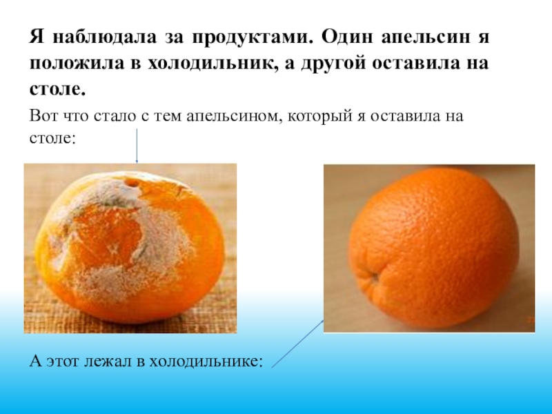 Слайд 10Я наблюдала за продуктами. Один апельсин я положила в холодильник, а