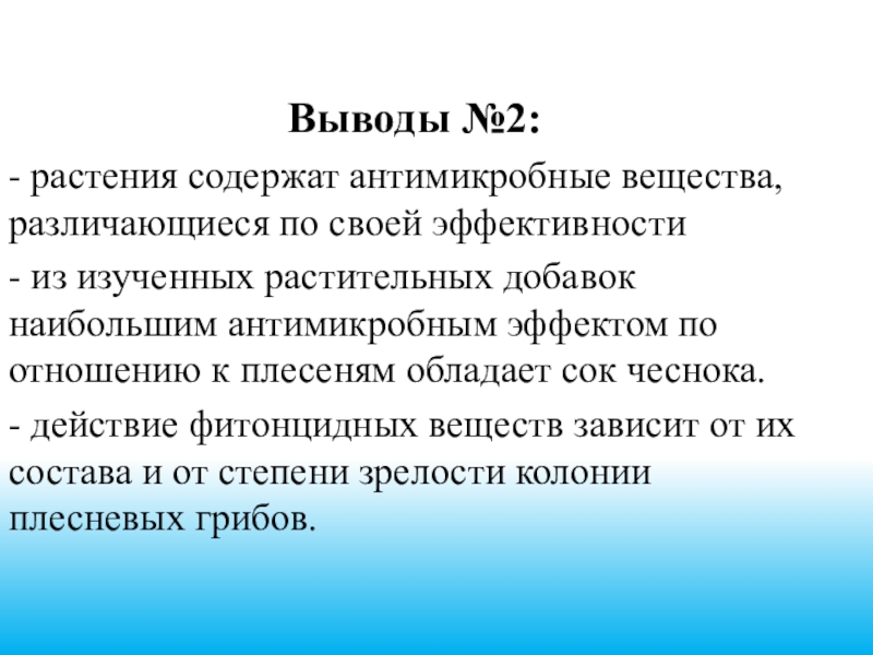 Выводы №2:- растения содержат антимикробные вещества, различающиеся по своей эффективности- из изученных растительных добавок наибольшим антимикробным эффектом по отношению