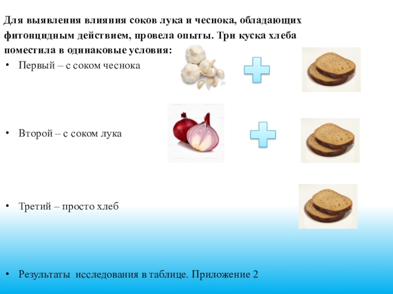 Для выявления влияния соков лука и чеснока, обладающихфитонцидным действием, провела опыты. Три куска хлебапоместила в одинаковые условия:Первый