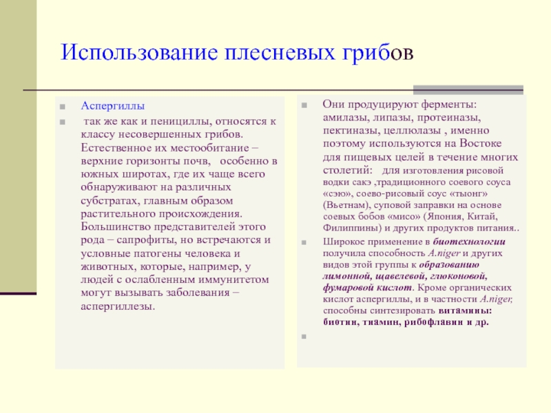 Они продуцируют ферменты: амилазы, липазы, протеиназы, пектиназы, целлюлазы , именно поэтому используются на Востоке для пищевых целей в течение многих столетий: для изготовления рисовой водки сакэ ,традиционного соевого соуса«сэю», соево-рисовый соус «тыонг» (Вьетнам), суповой заправки на основе соевых бобов «мисо» (Япония, Китай, Филиппины) и других продуктов питания..