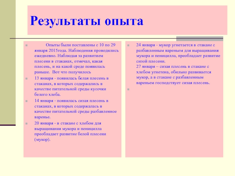 27 января – сизая плесень в стакане с хлебом угнетена, обильно развивается мукор, а в стакане с разбавленным вареньем господствует сизая плесень.