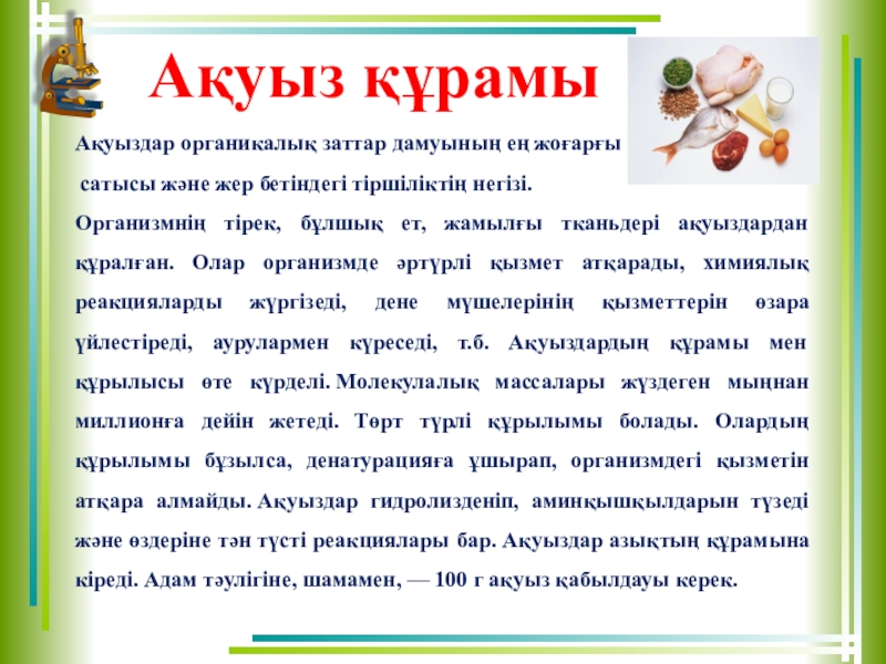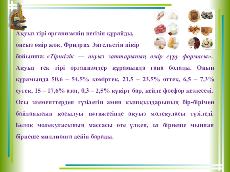 бойынша: «Тіршілік — ақуыз заттарының өмір сүру формасы». Ақуыз тек тірі организмдер құрамында ғана болады. Оның құрамында 50,6 – 54,5% көміртек, 21,5 – 23,5% оттек, 6,5 – 7,3% сутек, 15 – 17,6% азот, 0,3 – 2,5% күкірт бар, кейде фосфор кездеседі. Осы элементтерден түзілетін амин кышқылдарының бір-бірімен байланысып қосылуы нәтижесінде ақуыз молекуласы түзіледі. Белок молекуласының массасы өте үлкен, ол бірнеше мыңнан бірнеше миллионға дейін барады.