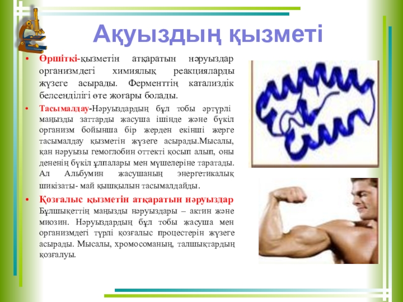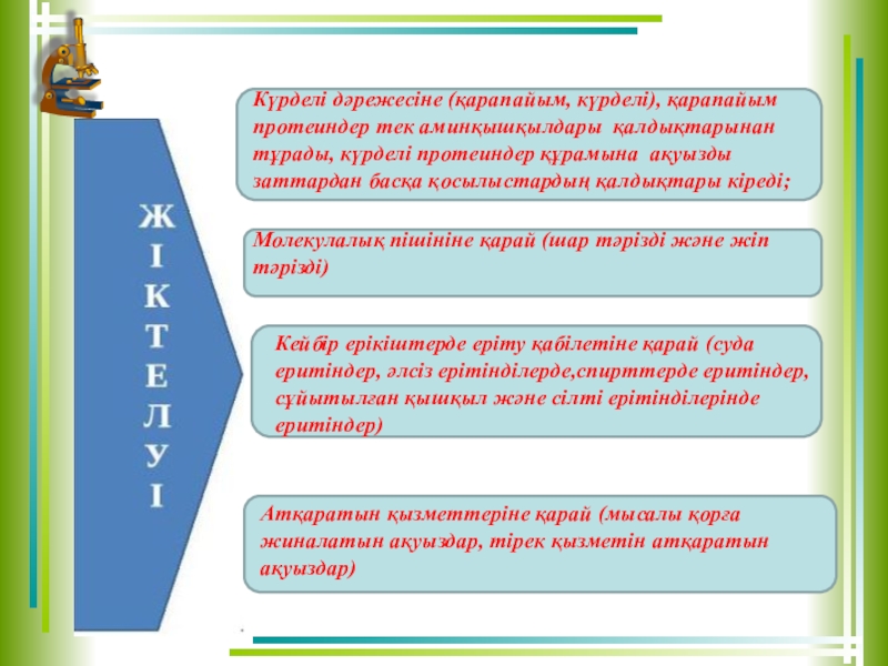 Атқаратын қызметтеріне қарай (мысалы қорға жиналатын ақуыздар, тірек қызметін атқаратын ақуыздар)