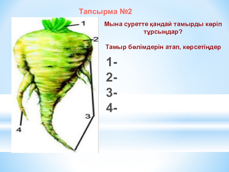 Тапсырма №2Мына суретте қандай тамырды көріп тұрсыңдар?Тамыр бөлімдерін атап, көрсетіңдер1-2-3-4-