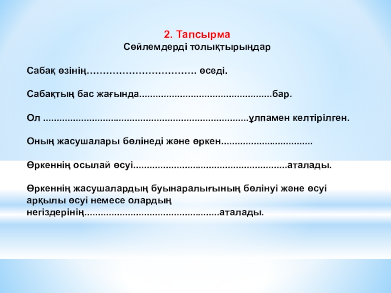 2. ТапсырмаСөйлемдерді толықтырыңдарСабақ өзінің……………………………. өседі.Сабақтың бас жағында.................................................бар.Ол ............................................................................ұлпамен келтірілген.Оның жасушалары бөлінеді және өркен..................................Өркеннің осылай өсуі.........................................................аталады.Өркеннің жасушалардың буынаралығының