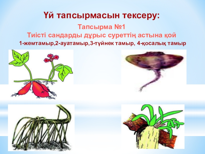 Үй тапсырмасын тексеру:Тапсырма №1Тиісті сандарды дұрыс суреттің астына қой1-жемтамыр,2-ауатамыр,3-түйнек тамыр, 4-қосалық тамыр