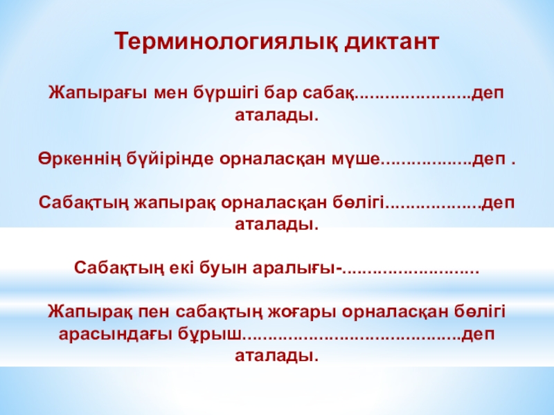 Терминологиялық диктантЖапырағы мен бүршігі бар сабақ.......................деп аталады.Өркеннің бүйірінде орналасқан мүше..................деп .Сабақтың жапырақ орналасқан бөлігі...................деп аталады.Сабақтың екі буын