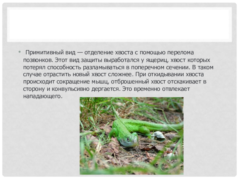 Слайд 10 Примитивный вид — отделение хвоста с помощью перелома позвонков. Этот вид
