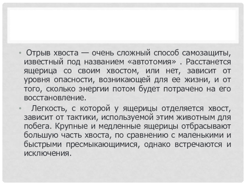Слайд 8 Отрыв хвоста — очень сложный способ самозащиты, известный под названием «автотомия»