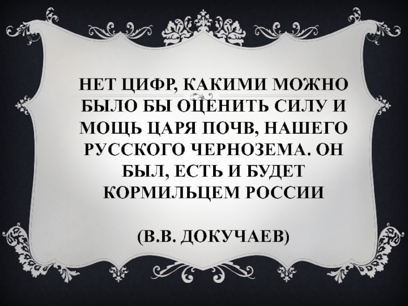 — чернозёмов. Не случайно именно чернозём считается «царем почв». Именно с чернозёмов берет начало созданная нашим великим соотечественником Василием Васильевичем Докучаевым наука о почвах…» (В.И. Вернадский, 1904 г.).