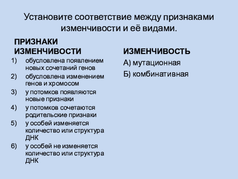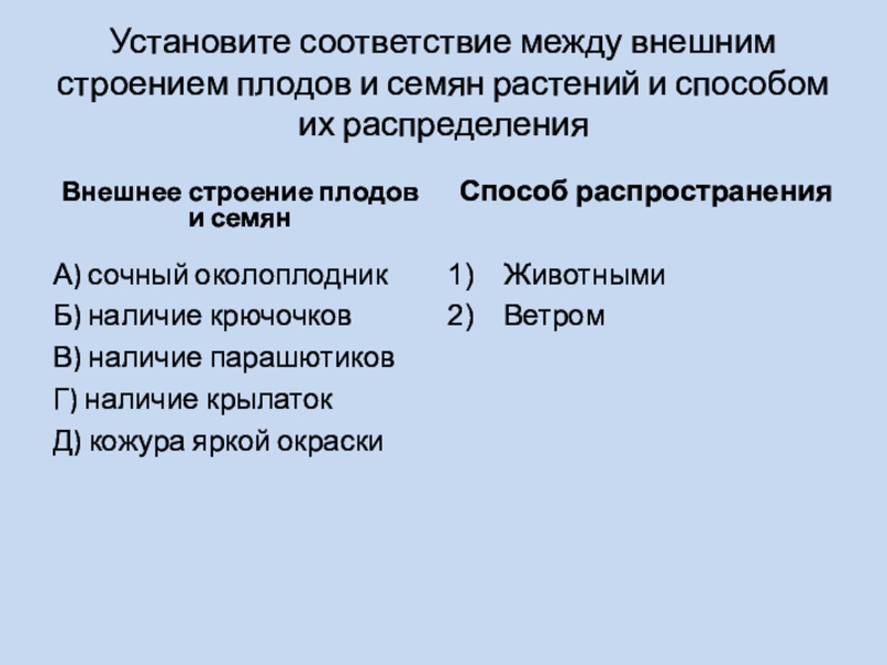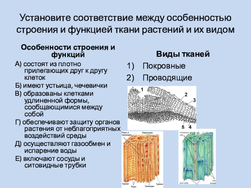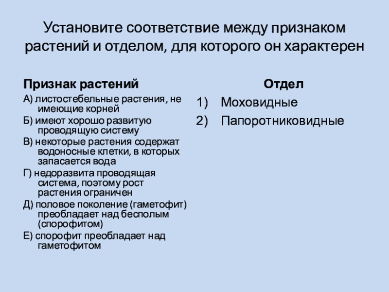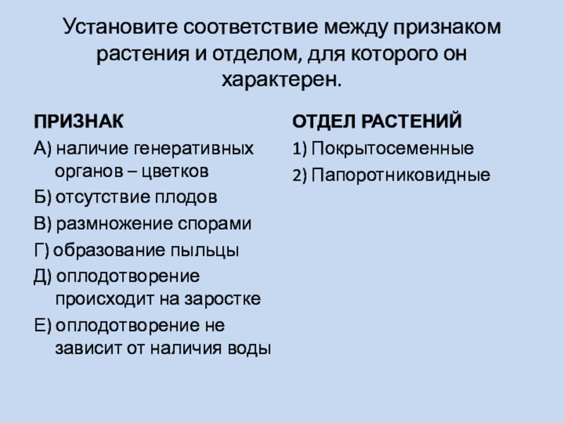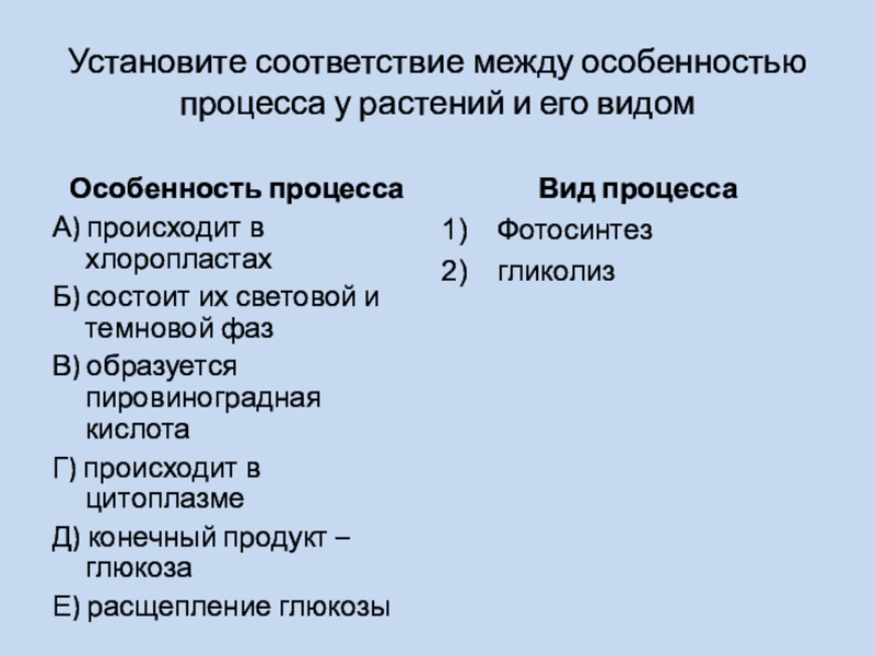 Слайд 66Установите соответствие между особенностью процесса у растений и его видом
