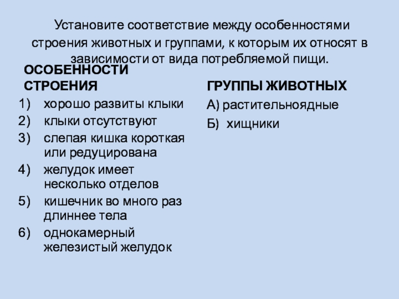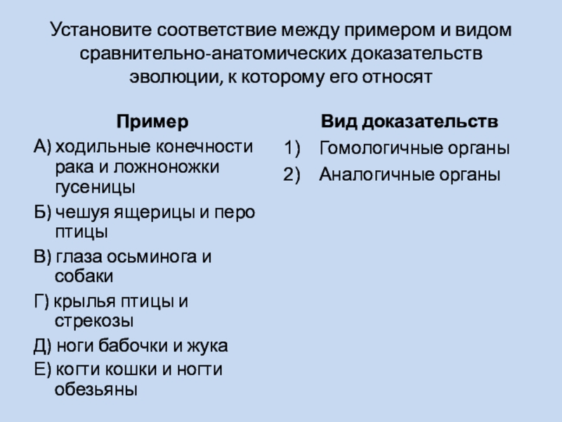 Слайд 69Установите соответствие между примером и видом сравнительно-анатомических доказательств эволюции, к которому