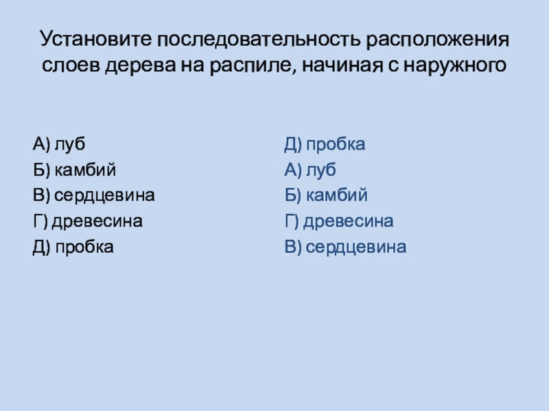 Слайд 70Установите последовательность расположения слоев дерева на распиле, начиная с наружного