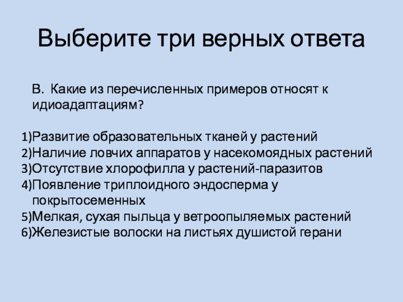 В. Какие из перечисленных примеров относят к идиоадаптациям?