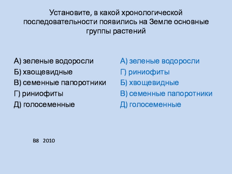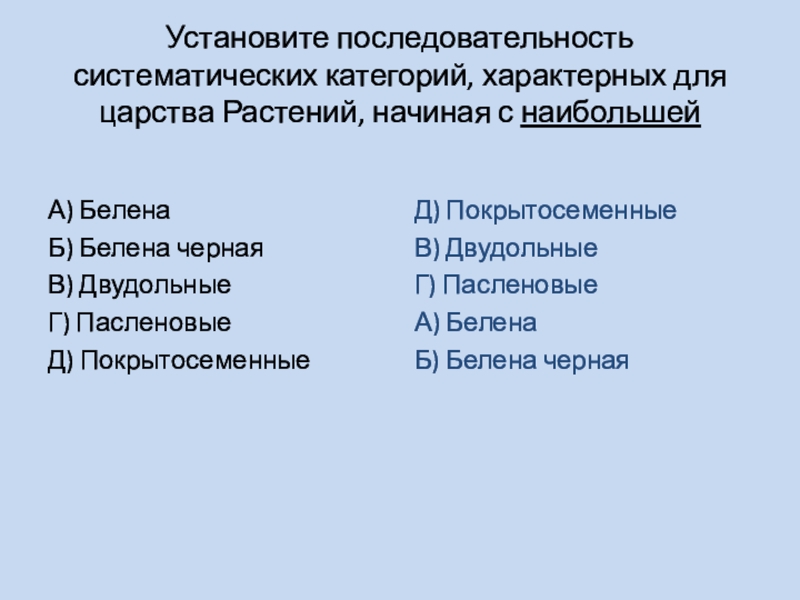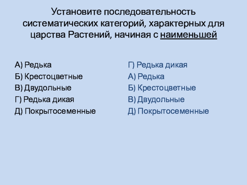 Слайд 8Установите последовательность систематических категорий, характерных для царства Растений, начиная с наибольшей