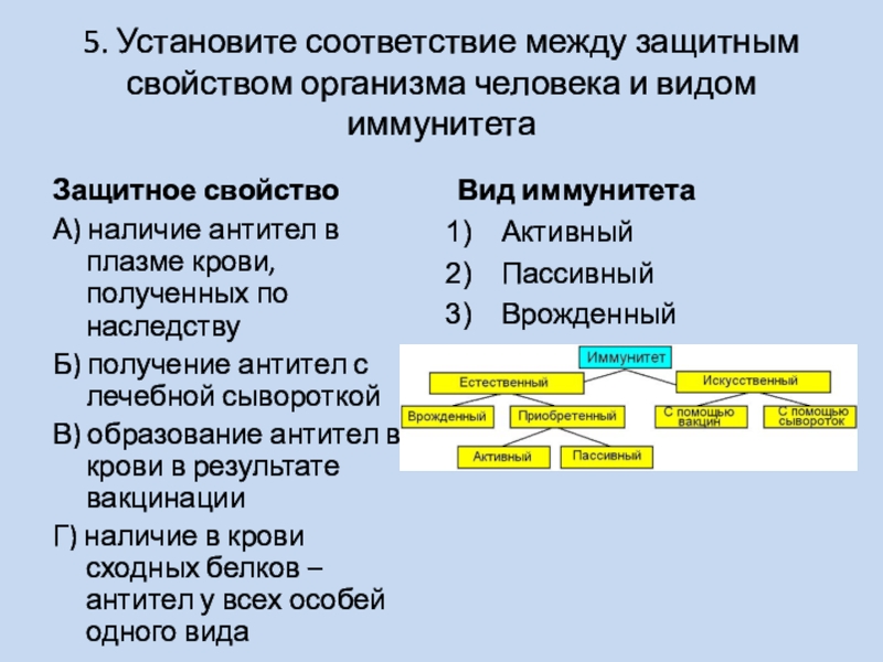 Слайд 65. Установите соответствие между защитным свойством организма человека и видом иммунитета