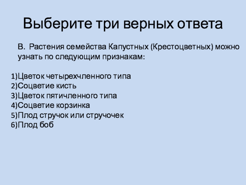 В. Растения семейства Капустных (Крестоцветных) можно узнать по