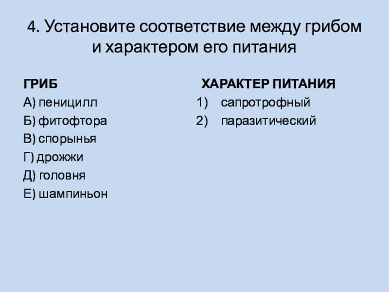 Слайд 54. Установите соответствие между грибом и характером его питания