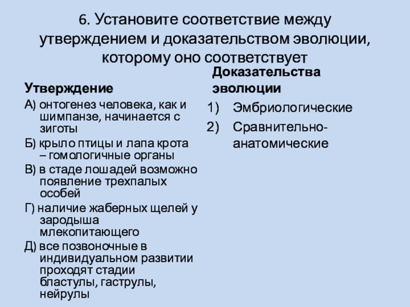 Слайд 76. Установите соответствие между утверждением и доказательством эволюции, которому оно соответствует