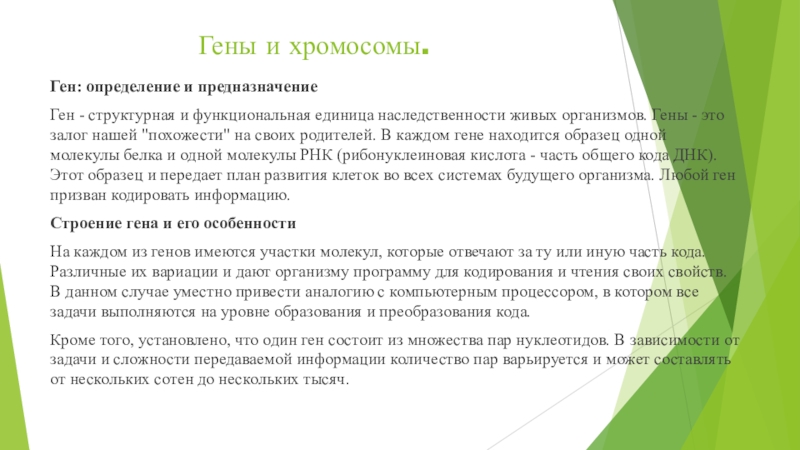 наследственности живых организмов. Гены - это залог нашей "похожести" на своих родителей. В каждом гене находится образец одной молекулы белка и одной молекулы РНК (рибонуклеиновая кислота - часть общего кода ДНК). Этот образец и передает план развития клеток во всех системах будущего организма. Любой ген призван кодировать информацию.